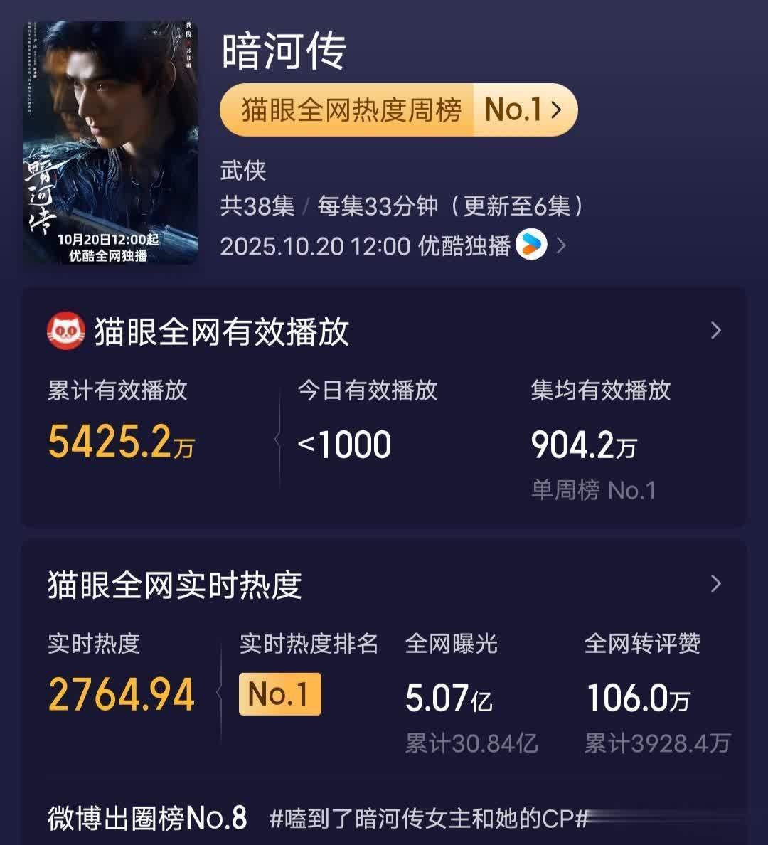 古装武侠剧终于上强度了,《暗河传》上天,猫眼热度全网第一,播放量万,热度,这个成绩太耀眼了。